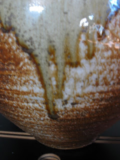 These two pictures are close ups of the glaze effects from the long wood firing in our Anagama, The pots go in the kiln without any slip or glaze coating - just dry clay. The firing of about ten days gives many coatings of ash which melts and combines with the clay surface to produce these magnificent colours and effects. No wonder we thought it worthwhile to put so much effort into the firings.